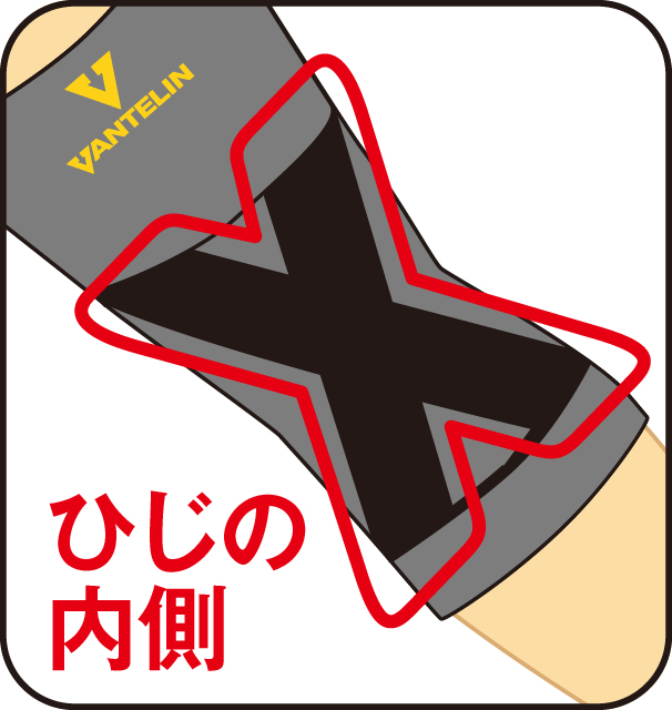 ひじの内側のX字型のテーピング編みが、ひじの過度な伸びやねじれを抑制し、重い物を持つ時などの不安を軽減します。