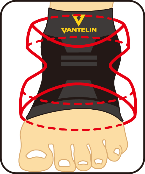 フィギュアエイト※型のテーピング編みが、足首のブレを抑制し、歩く時の不安を軽減します。また、土踏まずを持ち上げることで、足の動きがスムーズになり、疲れにくく、歩きやすくなります。※かかとを中心に足首に8の字型にテープを巻き、足首の動きを抑制するテーピング方法