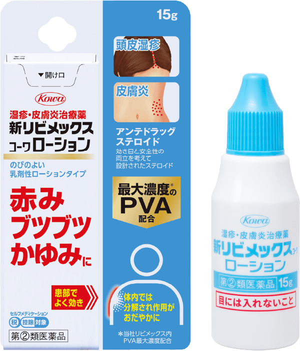 新リビメックスコーワは抗炎症成分PVAを0.3%配合した湿疹・皮膚炎治療薬です。新リビメックスコーワWはPVA0.3%に加えて、かゆみ止め成分の「ジフェンヒドラミン塩酸塩」と皮膚修復成分の「アラントイン」、血行促進成分の「トコフェロール酢酸エステル」を追加した配合剤になります。