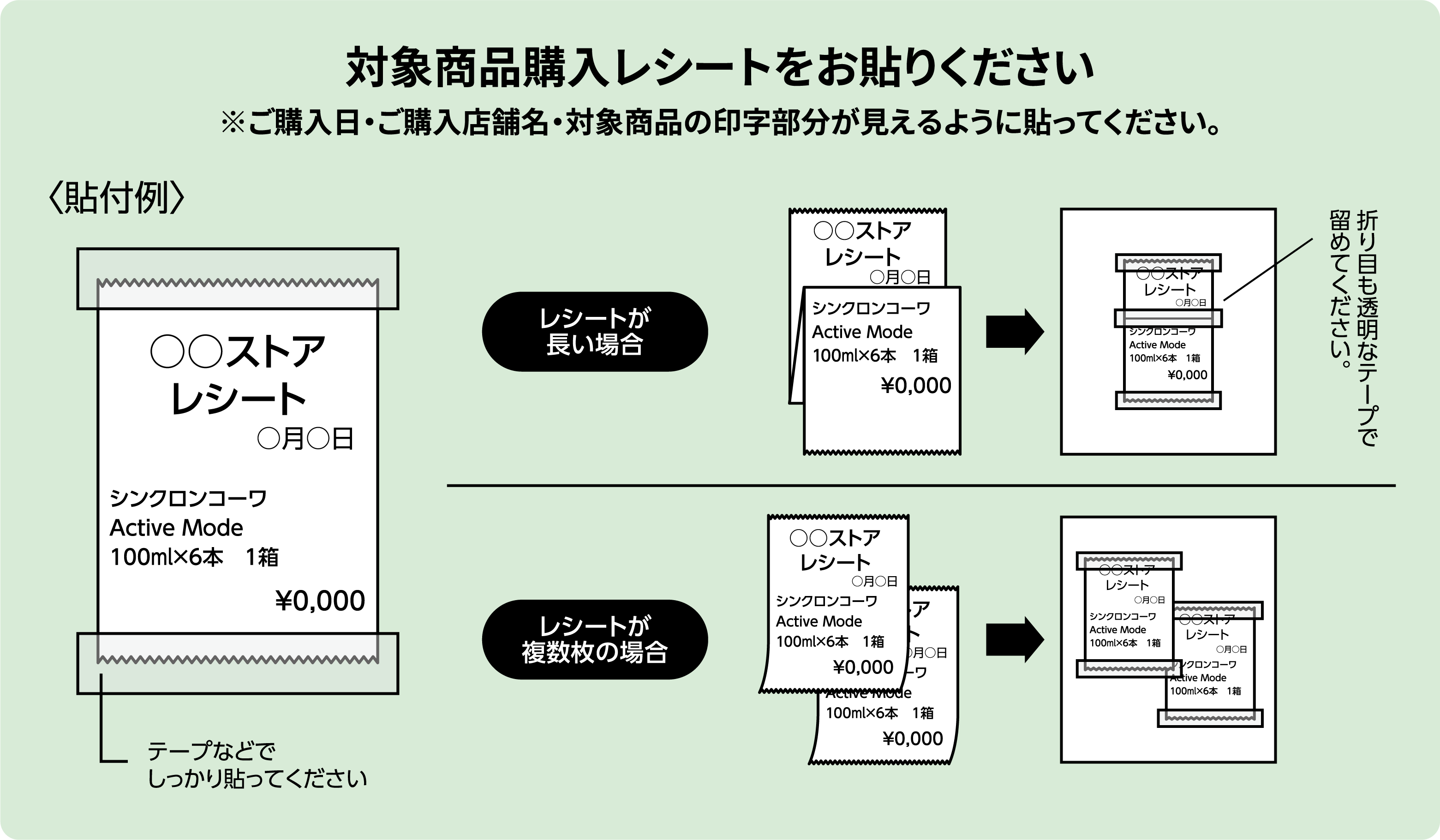 - 応募ハガキ1枚につき、レシート貼り付け枚数は何枚でも有効ですが、貼り切れない場合は、お手数ですが封筒にまとめて入れてご応募ください。